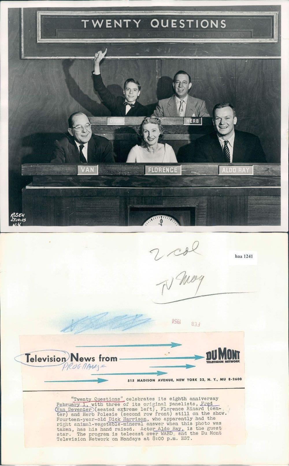 | 05:18, 15 September 2011 | ![]() | 1,000 × 1,609 (221 KB) | SreeBot (talk | contribs) | (Original text) : {{Information |Description=Publicity photo from the game show ''Twenty Questions''. Actor Aldo Ray is in the photo as a guest panelist. |Source=[http://www.ebay.com/itm/1954-Gameshow-Panelists-Twenty-Questions-Wire-Photo-/300547744074 |