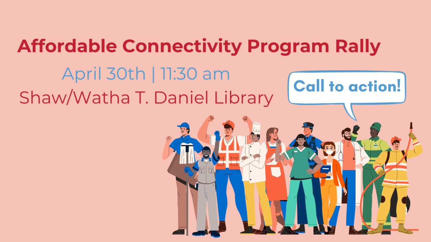 Join Public Knowledge, Civic Nation, National Hispanic Media Coalition (NHMC), National Digital Inclusion Alliance (NDIA), and Digital Progress Institute (DPI) for a public rally on Tuesday, April 30th at 11:30 am at the Shaw/Watha T. Daniel Library to fight for the Affordable Connectivity Program (ACP)!