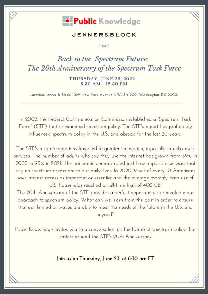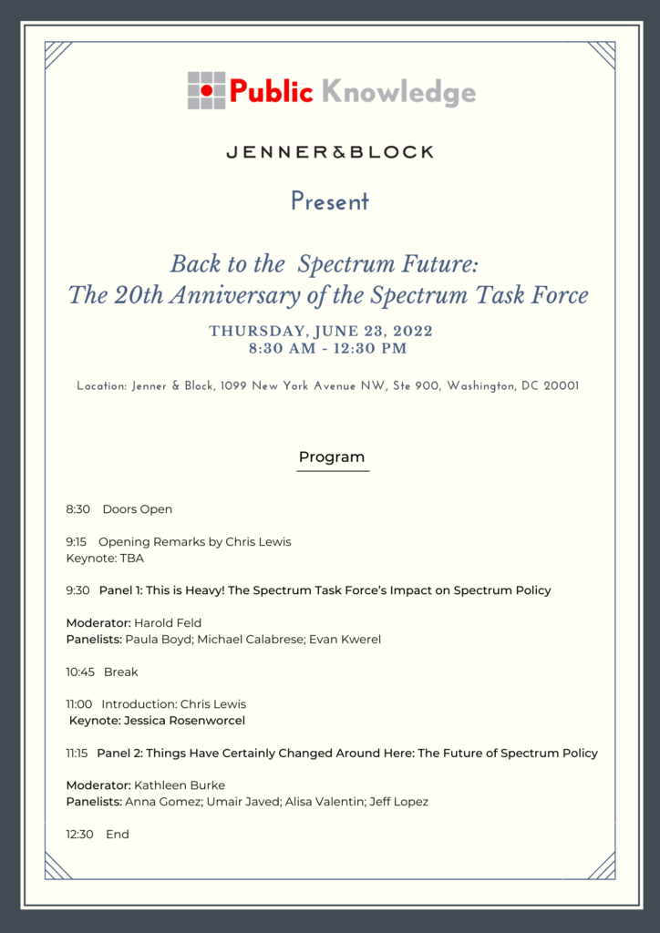 Back to the Spectrum Future: The 20th Anniversary of the Spectrum Task ForceBack to the Spectrum Future: The 20th Anniversary of the Spectrum Task ForceBack to the Spectrum Future: The 20th Anniversary of the Spectrum Task Force Get Involved Today By Michele AmbadiangMay 25, 2022 Related Events The People’s Oversight Hearing Events Privileged Conversations | Nov. 2025 Press Release Public Knowledge Urges FCC Chairman Carr To Protect Phone Network in VOIP Action Events Privileged Conversations | Oct. 2025 Press Release Public Knowledge Joins 21 Public Interest Groups Urging FCC To Defend First Amendment, Rule of Law Insights That Escalated Quickly. Chairman Carr Completely Restructures the Wireless Market into an Oligopoly.