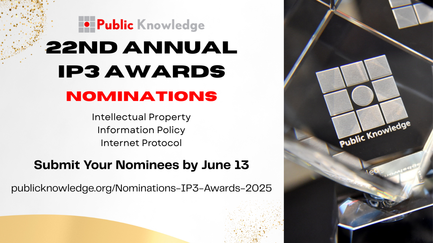 It’s time for Public Knowledge’s 22nd Annual IP3 Awards! We’re searching for visionaries and dedicated individuals making waves in Intellectual Property, Information Policy, and Internet Protocol.
