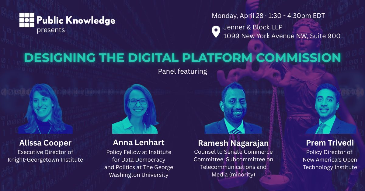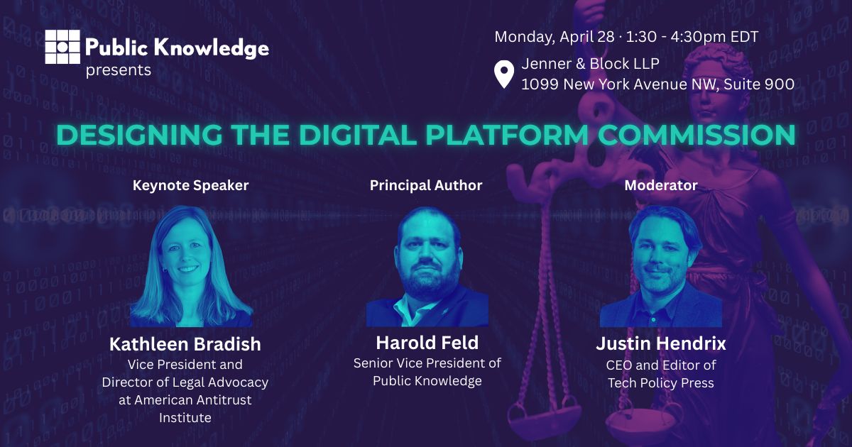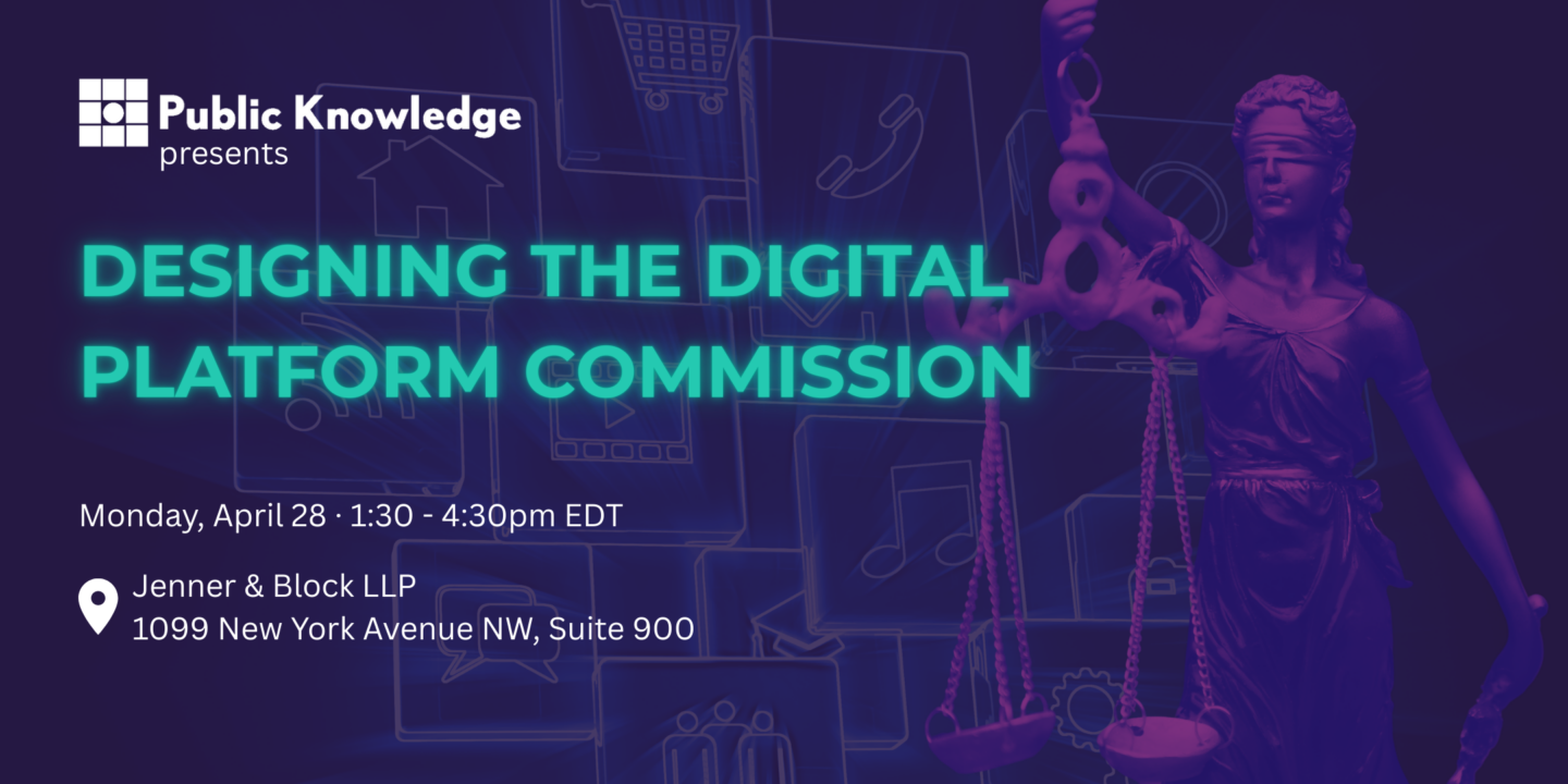 For more than a year, Public Knowledge has surveyed advocates and convened experts to determine the most effective and efficient way to promote competition and protect consumers online. Join us as we present and discuss our new paper, “Building the Digital Platform Commission: How to Design a Regulator to Rein In Big Tech.” Written by Public Knowledge’s Senior Vice President Harold Feld and Policy Director Lisa Macpherson, this new paper provides concrete recommendations for policymakers and stakeholders interested in creating a digital future that protects consumers from rip-offs and anticompetitive practices. Harold Feld will present the paper to a panel of experts, who will provide feedback on the paper and next steps.