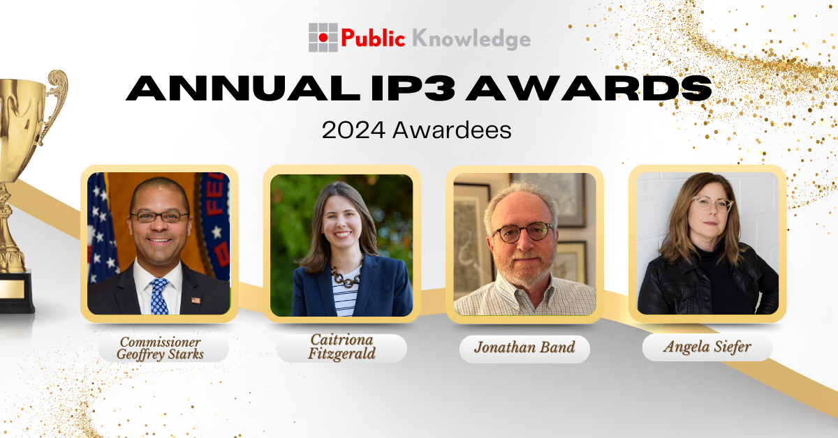 Public Knowledge hosts the Annual IP3 Awards to celebrate the work of those who have made significant contributions in the three areas of IP: Intellectual Property, Information Policy, and Internet Protocol. The awards help champion the advocates working diligently on behalf of the public interest to help everyone connect and communicate.